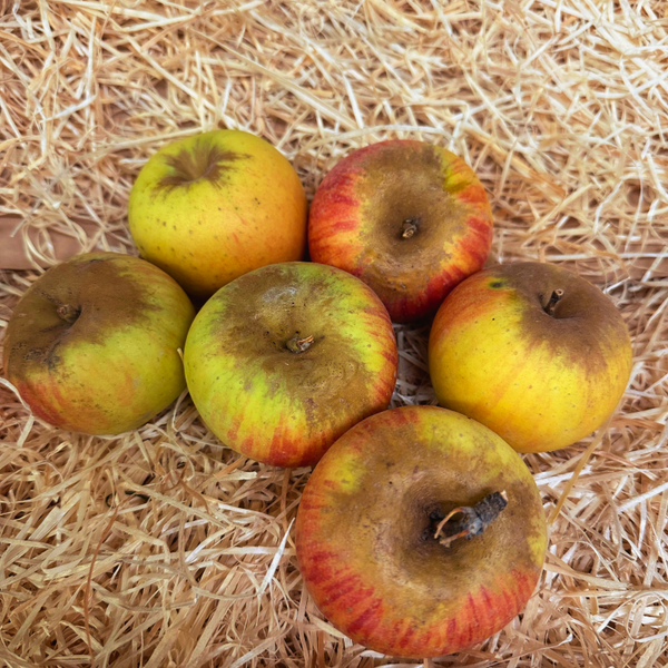 La pomme reine des reinettes a une peau rouge orangée striée sur fond jaune doré. Bien sucrée quand elle est mûre à souhait et légèrement acide, C'est la pomme de tradition de référence pour la France. Du goût, des arômes, elle est incomparable au début du mois de septembre... Attention, s’il y en a aussi peu dans les vergers c'est qu'elle demande beaucoup de soin. Ce n'est pas une variété de pomme de conservation (2 mois au plus, car elle devient farineuse).